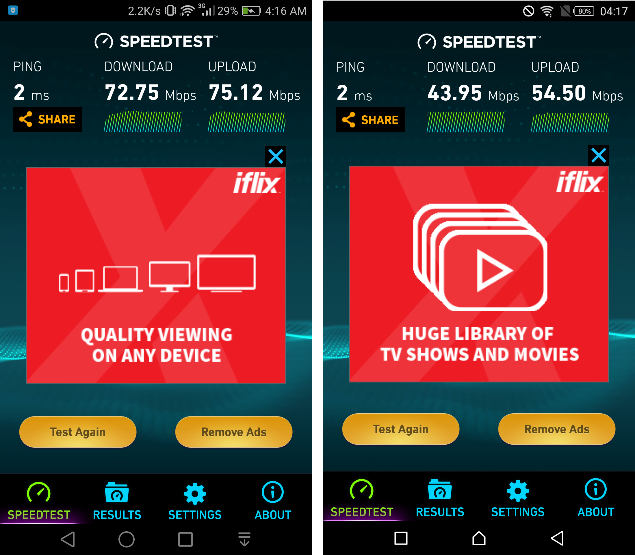 One other thing which bothered me a little bit is that Zero 4 plus is apparently using a slower Wi-Fi chipset. Below is a comparison between Huawei Honor 6x and Infinix Zero 4 Plus on the same Wi-Fi network with no other device connected to the network. 6X was able to achieve full 70 Mbps upload and download speed of the network while Zero 4 Plus managed to hit only 43 Mbps download and 54 Mbps upload speed. I repeated the test several times but got the same result every time.