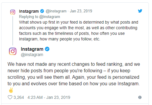 Instagram in a series of tweets explained that these posts aren’t true, “We have not made any recent changes to feed ranking, and we never hide posts from people you’re following – if you keep scrolling, you will see them all. Again, your feed is personalized to you and evolves over time based on how you use Instagram.”