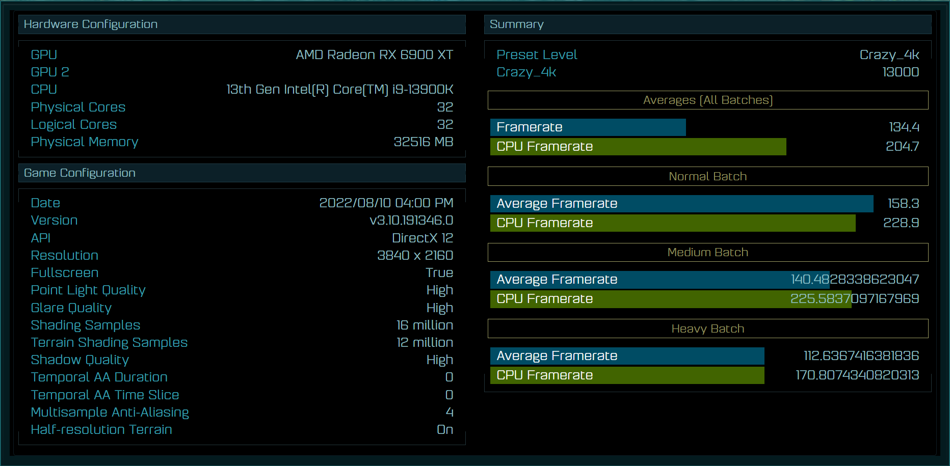 Because the other chips haven’t been tested at the Crazy 1080p setting in the current version of the benchmark, we can only use the Crazy 4K preset statistics. The Crazy 4K preset was tested using the DX12 API, with the following results. At the same settings, the Intel Core i9-13900K achieved an average framerate of 205.4 FPS, up to 24% quicker than the Intel Core i9-12900K, which reached 165.3 FPS. The AMD Ryzen 9 5950X scored 143.5 FPS, and the Ryzen 7 5800X3D got 121.4 FPS, implying that the Raptor Lake flagship is 43% and 68% quicker, respectively.