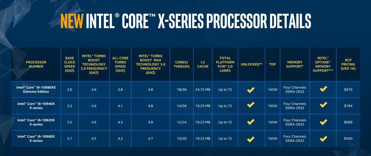 The flagship of this new X-series lineup, called Cascade-X based on the Cascade Lake architecture, is the Core i9-10908XE, which comes in at $979. This might not sound like much of a bargain, but this processor features a clock speed of 3GHz (4.8 GHz turbo) and packs 18 cores, giving users the ultimate gaming performance in this price range. If this is a bit too much for you, there are other options as well, like the 10-core i9-10900XE ($590), the 12-core i9-10920XE ($689) and the 14-core i9-10940XE ($784).