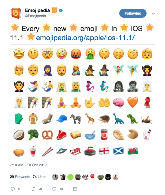 Apple is releasing a new set of emoji with iOS 11.1. The new emoji will include emotive smiley faces, gender-neutral characters, clothing options, food types, animals, mythical creatures and more. There’ll be a total of 69 new emoji.