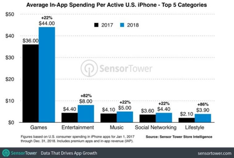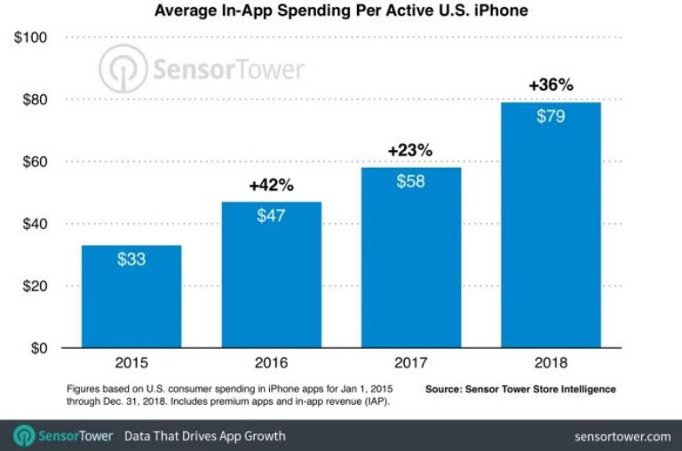 According to a report from an app-analytics agency SensorTower, Apple has recently witnessed a considerable rise in the revenue generated through the app or in-app purchases done by its users. The US-based iPhone users spent on average $21 more on application purchases than the amount they had spent the previous year. The revenue generated by Apple through these transactions shown an increase of 36%, standing at $79 after rising from $58 in the previous year.