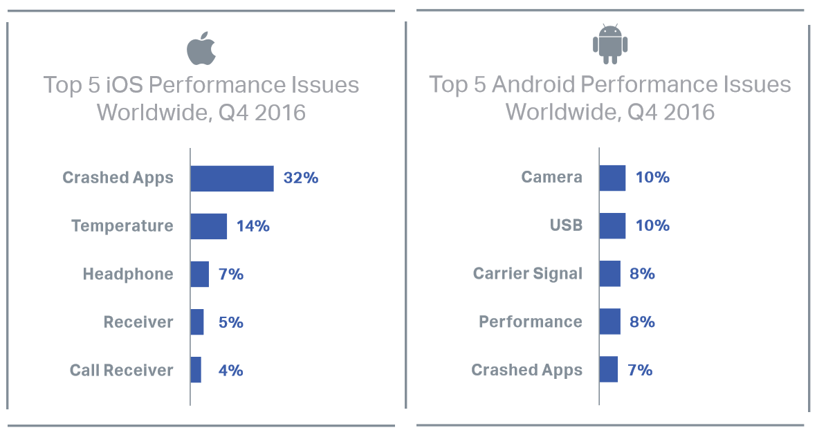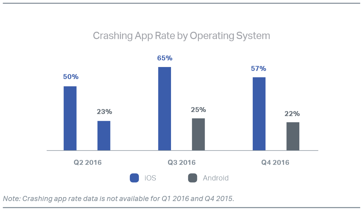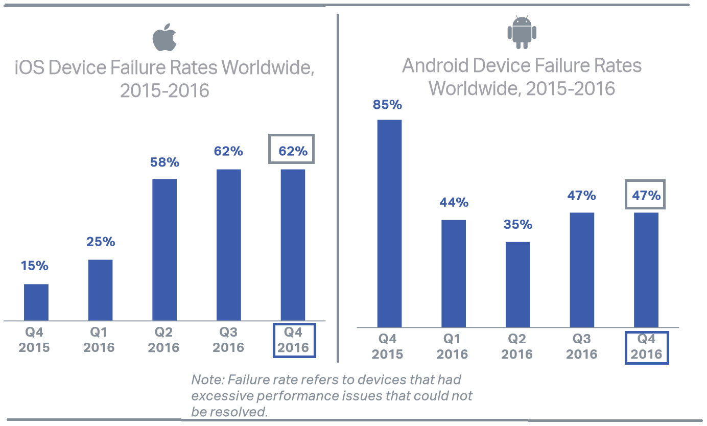Although iOS devices haven’t always had a higher failure rate, it has steadily increased quarter over quarter for the last year until it finally stabilized in Q4 2016.