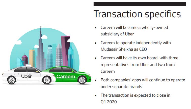 Uber and Careem have reached an agreement for Uber to acquire Careem for $3.1 billion, consisting of $1.7 billion in convertible notes and $1.4 billion in cash. The acquisition of Careem is subject to applicable regulatory approvals. The transaction is expected to close in Q1 2020.