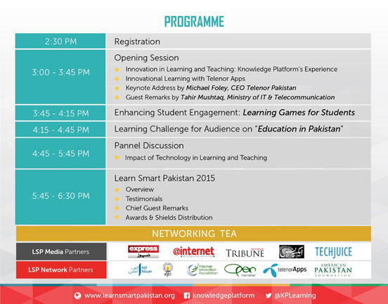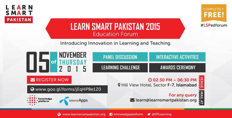 To culminate Learn Smart Pakistan 2015,Knowledge Platform is organizing an Education Forum, to be held in Islamabad on November 5th. The primary aim of the forum is to bring together experts from both the education and technology industries to investigate the macro trends that are shaping the education industry within Pakistan, and identify market opportunities for educational institutions to stay competitive and relevant in an increasingly digital world. The event will focus on Innovation in Learning and Teaching by demonstrating the use of technology and digital content for in-class and out-of-class knowledge acquisition. The audience will be introduced to high impact interactive educational games and content tailored to Pakistan’s Educational Institutions, followed by a panel of experts who will give their insights on the vibrant national EdTech landscape. The Awards Ceremony for Pakistan’s only digital learning challenge will be organized as a part of the Education Forum.