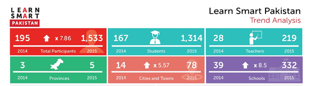 Learn Smart Pakistan was introduced by Knowledge Platform in 2014 as a non-profit initiative with the aim of providing Pakistani students and teachers with quality educational resources. Following the unprecedented success of Learn Smart Pakistan 2014, the learning challenge was launched once again during the summer of 2015. However, this year the competition was expanded to include two additional subjects (English and Mathematics) in addition to components such as teacher boot camps and student workshops. The participation rate for LSP 2015 increased 7.9 times: 1,533 participants (including 1,314 students and 219 teachers) enrolled from 332 schools and 78 cities across Pakistan.