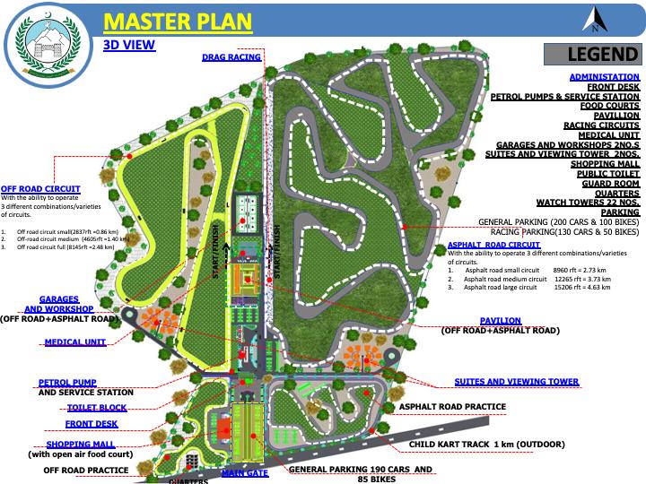 According to reports, KPK’s Sports and Tourism Department has shared a detailed plan for a mega-project with the provincial Chief Minister Mahmood Khan. The model features a drag race track, practice tracks for on-road and off-road driving, off-road track circuits, asphalt track circuits, and even a go-kart track.