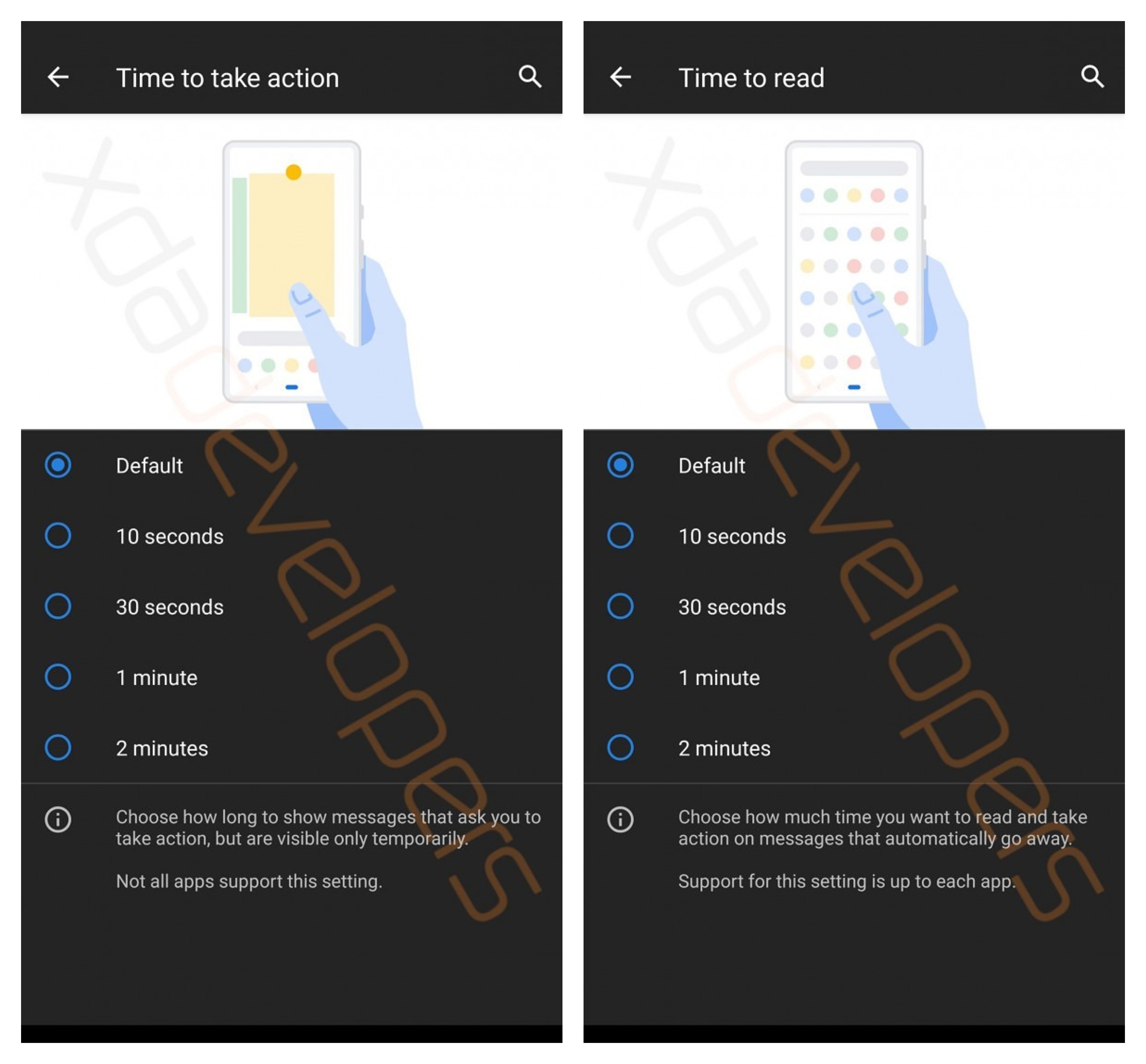 Other additions include two new options in the accessibility page, Time to take action and Time to read.