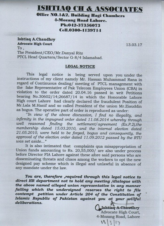 “This legal notice is being served upon you under the instructions of my client namely Mr. Hassan Muhammad Rana in regard of Continuous dealing/ meeting of PTCL management with the fake Representative of Pak Telecom Employees Union (CBA) in violation to the order dated 20.04.16 passed in writ Petitions bearing No.30602/14; 26687/14 in which the Honorable Lahore High court Lahore had clearly declared the fraudulent Position of Mr.Lala M.Hanif and to called President of the union Mr.Ziauddin as bogus.”
