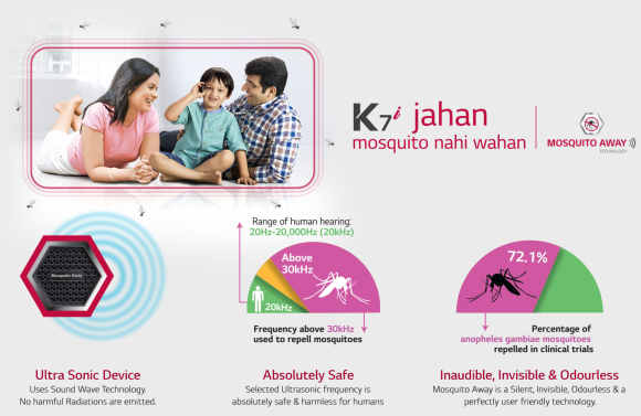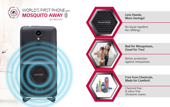 The new smartphone is LG K7i and it is equipped with the “Mosquito Away” technology. As the name implies, the LG K7i will repel the mosquitoes. It produces an ultrasonic sound which is not audible to human beings but audible to mosquitoes. So it will repel the mosquitoes away from you if you have the phone near you.