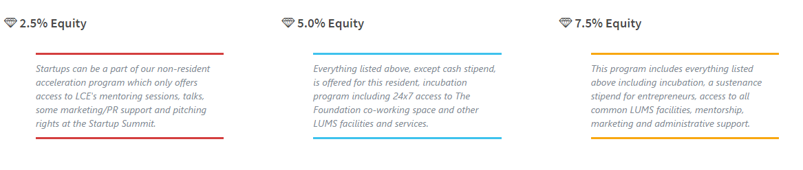The Foundation offers 4 months of co-working office facility at LUMS, access to all the labs and IT infrastructure of the university, regular mentoring, access to investors at the Startup Summit and sustenance stipend for up to 4 co-founders. In exchange, LCE takes equity in the startup, ranging from 2.5% to 7.5%.