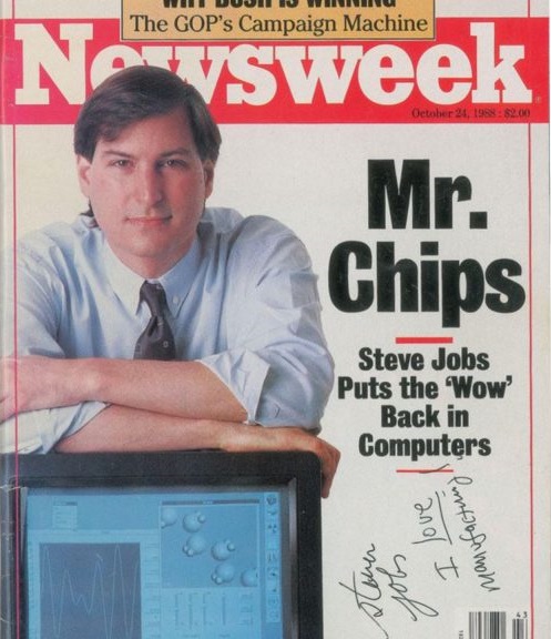 The magazine dates 29 years back to October 24, 1988. The headline of the magazine reads “Mr. Chips. Steve Jobs Puts The ‘Wow’ Back In Computers” and it has a cover photo of Steve Jobs who was 33 years old at that time. The magazine covered the story behind the unveiling of the very first NeXT Computer. The most interesting thing about this particular copy of the magazine is that it is signed by Steve Jobs.