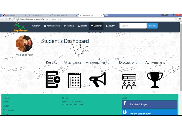 Lighthouse 2.0 is a web application for schools; parents and teachers to bridge the gap between parent-teacher communication and better manage children’s learning performance. The application makes use of identification tags which are provided to each student to report the key issues regarding student’s learning and timely measure can let teachers communicate through the system for responsive action with help of Parents and school administration. The team members for the project are Talha Shahzad and Faizan Amjad.