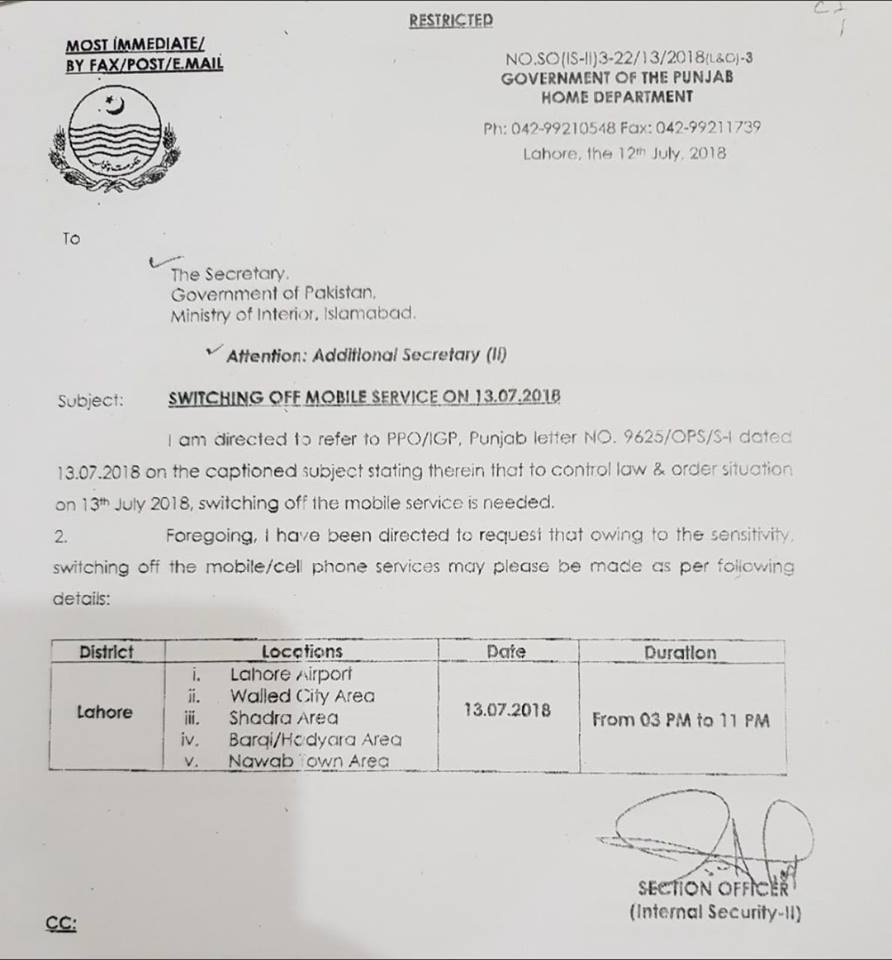 Punjab provincial government has issued a letter to Interior Minister of the Federal government saying that in order to control law and order situation in the province on the arrival of ex-Prime Minister Nawaz Sharif, mobile phone service will be switched off in different areas of Lahore from 3 pm to 11 pm. As per the notice, the mobile network services will be suspended in areas of Lahore Airport, Walled City Area, Shadra Area, Barki/Hadyara Area and Nawab Town Area.