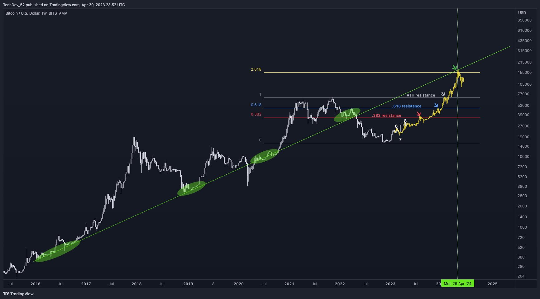 According to the latest analysis, TechDev confirmed the news that BTC/USD is expected to see a “parabolic top” around the year 2024 block subsidy halving.