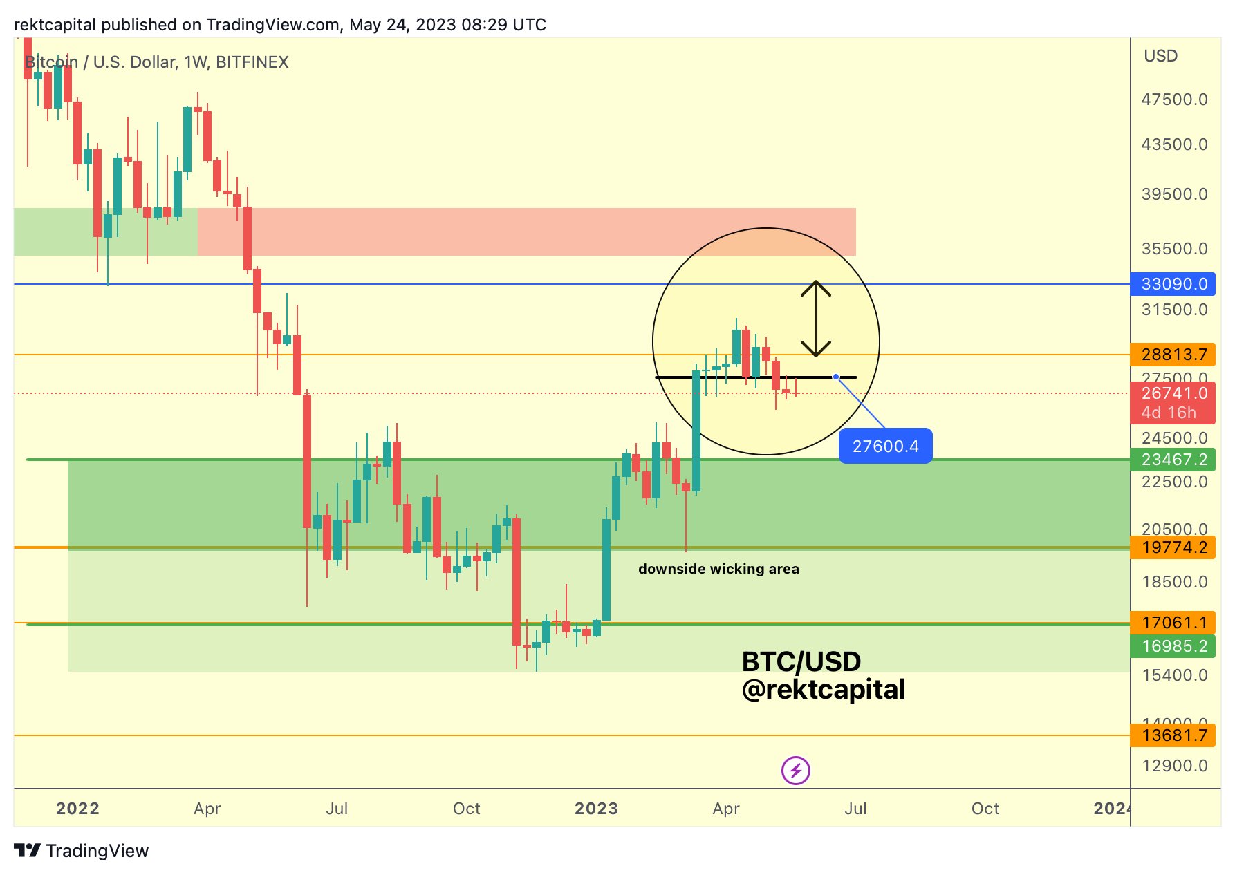 “Bitcoin continues to reject from -$27600 weeks ago, this level was decisively lost as support. And for the last two weeks it is a form resistance ” tweeted on May 24.