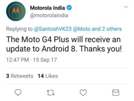 That’s not all. The official Motorola India page also tweeted that the G4 Plus will get the Android Oreo update and sadly the tweet was removed after a while. Here is a screenshot of the tweet.