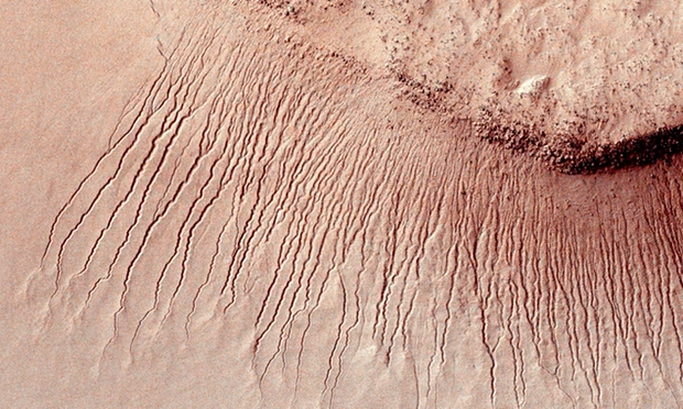 Liquid water runs down canyons and crater walls over the summer months on Mars. The trickles leave long, dark stains on the Martian terrain that can reach hundreds of metres downhill in the warmer months, before they dry up in the autumn as surface temperatures drop.