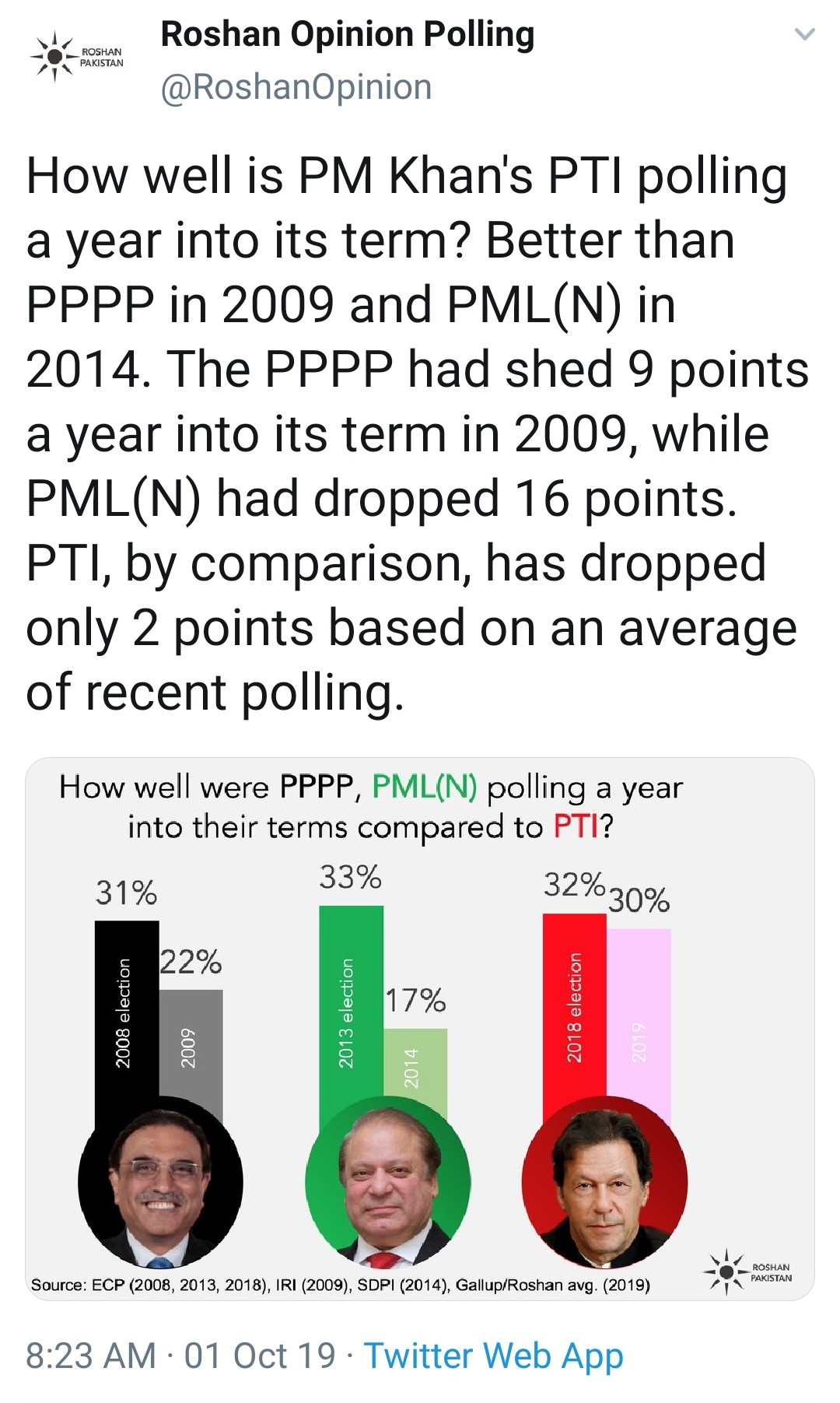 According to Roshan Pakistan, the new Government still holds better popularity among the general public as it only lost 2 points after being in power for one complete year, Roshan Pakistan reports that people are still content with the new government despite the increasing level of taxation and inflammation that has caused major spikes in prices of oil, imported cell phones and even non-productive days for car manufacturing companies such as Toyota Pakistan.