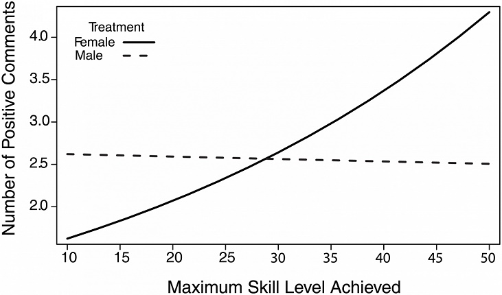 The above graph from the study suggests that men tend to treat each other in the same manner no matter what their skill level. However, as the skill level declines those men often pass nasty comments to the female players.