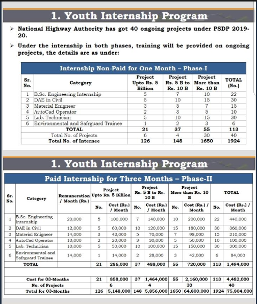 The first phase of the program will cover one-month internships that will be unpaid, whereas the second phase will have three-month internships with a stipend and a guarantee of a job offer. After the internees have completed this part of their training, they will be guaranteed a job with either an NHA firm, consultant or contractor for a minimum of 12 months. The program will include around 40 projects currently being worked on under the Public Sector Development Programme 2019-2020.