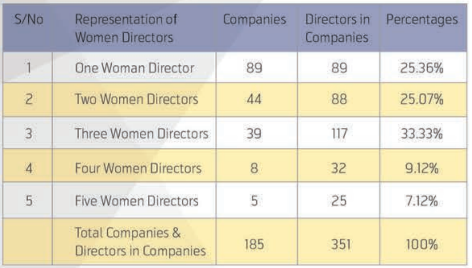 Out of 505 listed companies, women held Chairperson positions in only 36 (7.13%) companies, CEO positions in only 11 (2.18%) companies and CFO positions in only 9 (1.78%) companies in 2016. Women corporate secretaries had a representation in 27 companies.