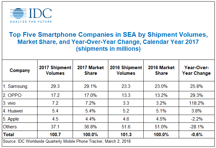 OPPO becomes 2nd biggest smartphone manufacturer in South-East Asia for 2017