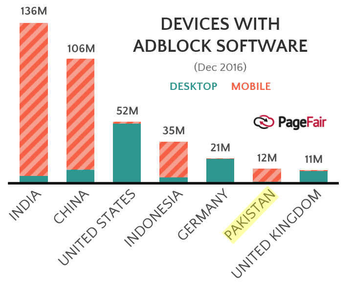 The report shows that 2% internet users in Pakistan use adblock on the desktop and 32% (more than 12 million) use it on Mobile. (July 2015-December 2016).