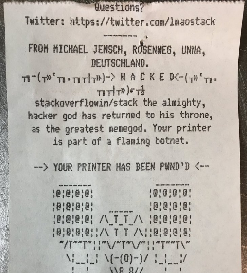 “stackoverflowin/stack the almighty, hacker god has returned to his throne, as the greatest memegod. Your printer is a part of flaming botnet. YOUR PRINTER HAS BEEN PWND’D.”