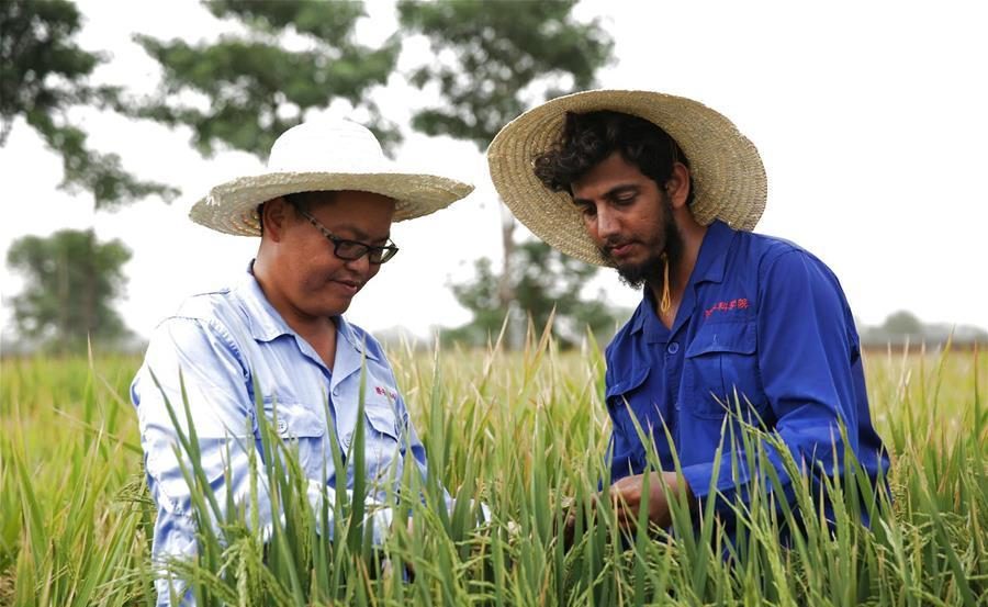 Ongoing projects include the partnership of Long Chunjiu (L), chief scientist of Longping South Asia Seed Research and Development Ltd, and research manager Wasim Waheed, who is currently working at a rice field in Lahore of Punjab province in Pakistan. A project was started here in 2014 and has been carried out by Guard Agriculture Research and Services in collaboration with the Chinese Yuan Longping High Tech Agriculture Company. In the project, they sow around 15,000 varieties of rice for research purposes whose data was used to select the best five types for the national trial. The project enabled Pakistan to develop hybrid rice seeds which is the core part of the production.