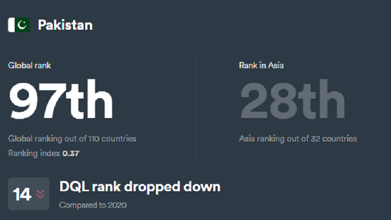 According to a renowned global ranking of countries in terms of digital quality of life, Pakistan suffers greatly from poor digital quality, with a global rank of 97 among a total of 110 countries.
