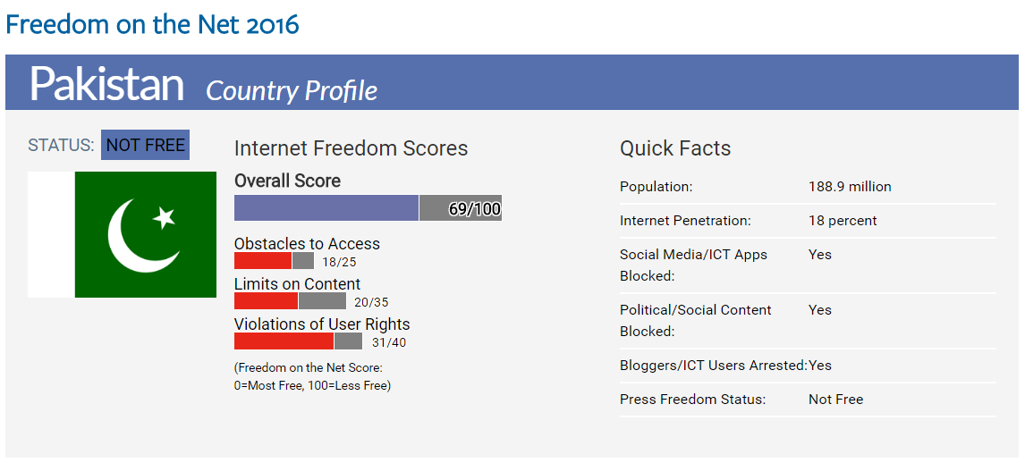 A American research firm, “Freedom House”, published its annual report on internet freedom,“Freedom on Net 2016, Silencing the Messenger: Communication Apps Under Pressure”. The report showed that Pakistan scored 69 on the scale of 0-100 on the cyber restriction index.