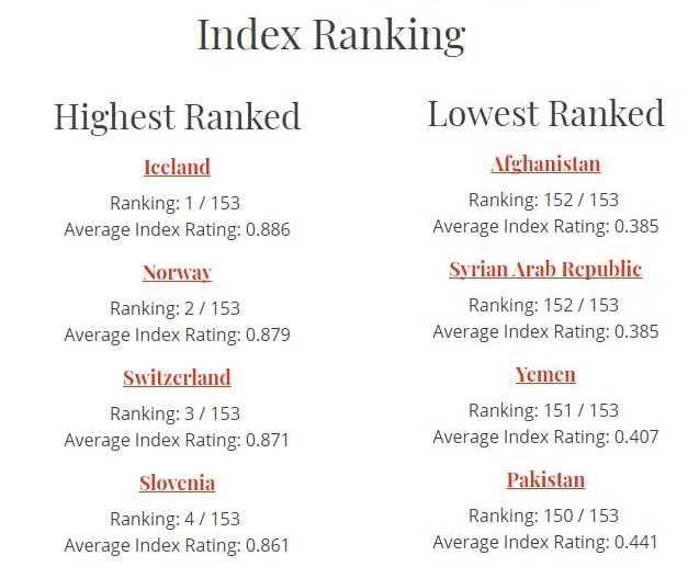 The other three countries with lowest rankings include Afghanistan, Syria, and Yemen in terms of women’s inclusion, security, and Justice. While countries like Iceland, Norway, Switzerland, and Slovenia are on the top with the same perspective.