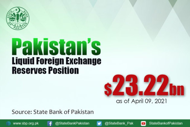 Pakistan’s foreign exchange reserves stood at the US $23.22 billion as of April 09, 2021, the central bank said on Thursday, an increase of 11% over $20.836 billion in the previous week, after recording a current account surplus of $881 million last month. The reserves held by the State Bank of Pakistan (SBP) decreased by $146 million to $13.527 billion due to external debt repayments, the State Bank said in a statement. The reserves of commercial banks also reduced to $7.152 billion from $7.163 billion last week.