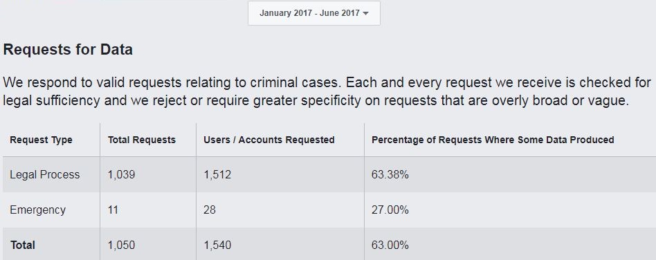 From January to June 2017, Pakistani government made 1,039 requests for different purposes for which 1,512 user accounts were requested for access. Facebook responded to almost 63% of the requests.