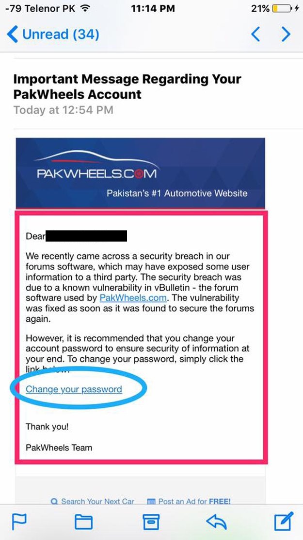 “We recently came across a security breach in our forums software, which may have exposed some user information to a third party. The security breach was due a known vulnerability in vBulletin – the forum software used by Pakwheels.com,”
