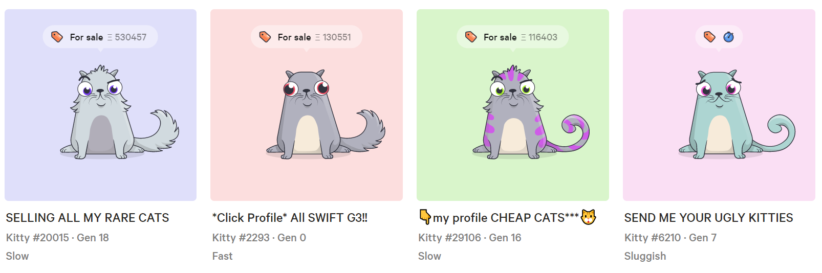 Cryptokitties allow people to own a unique DNA pet that lives on the Ethereum blockchain platform forever. The interesting thing here to notice is that you, yes you, are the only owner of that cat and nobody can mess up your pet.