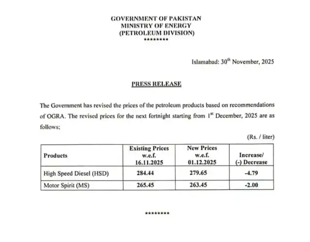 High speed diesel (HSD) also saw a reduction of Rs4.79, now priced at Rs279.65 per litre. Officials said these fortnightly adjustments are part of a routine review to ensure fuel prices remain in line with international crude oil rates while providing relief to consumers.