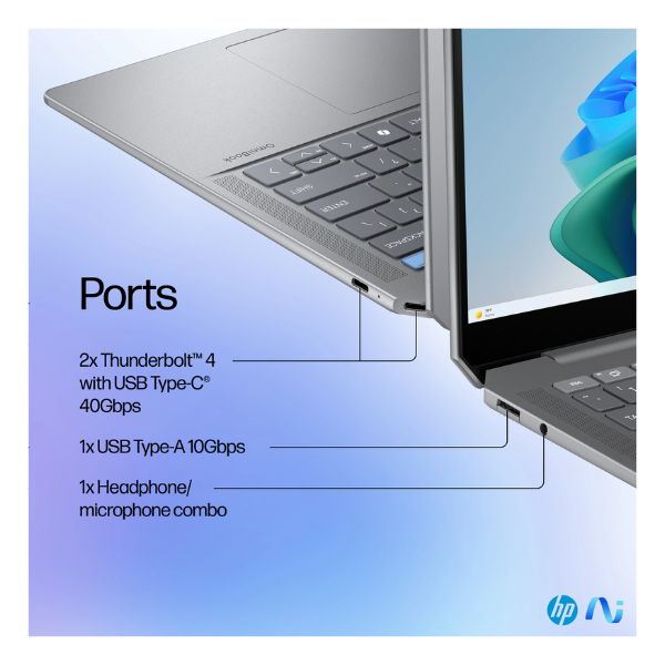 2 Thunderbolt™ 4 with USB Type-C® 40Gbps signaling rate (USB Power Delivery, DisplayPort™ 2.1, HP Sleep and Charge); 1 USB Type-A 10Gbps signaling rate (HP Sleep and Charge); 1 headphone/microphone combo[19]
