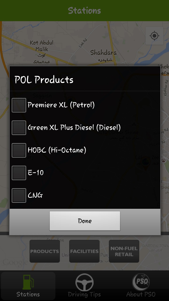 - Click on the screen when it appears after launching the app, a map appears without any PSO stations shown. Choose your preferred filters from the three shown in the images below: