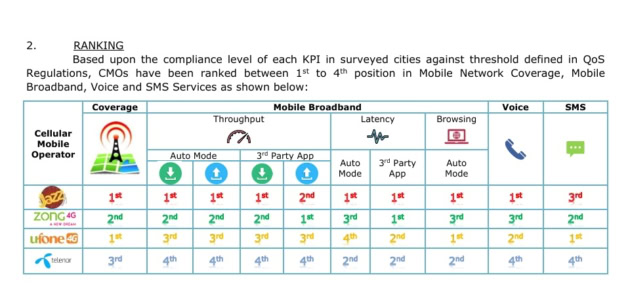 Jazz and Ufone jointly ranked first, followed by Zong and then Telenor.