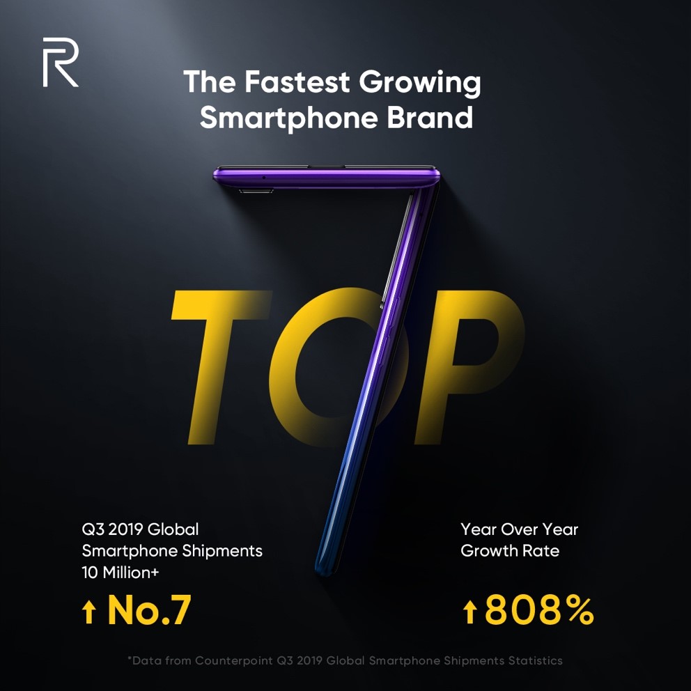 Smartphone brand realme announces that realme ranks the 7th according to the statistics of global smartphone shipments of realme in Q3 of 2019 from Counterpoint. It is the first time that realme becomes top 7 mobile phone brands after being top 10 in Q2 of 2019. More importantly, the total shipments of Q3 are more than 10 million and the year over year growth of realme reaches to 808% which ranks 1st among the world making it the fastest growing smartphone brand.