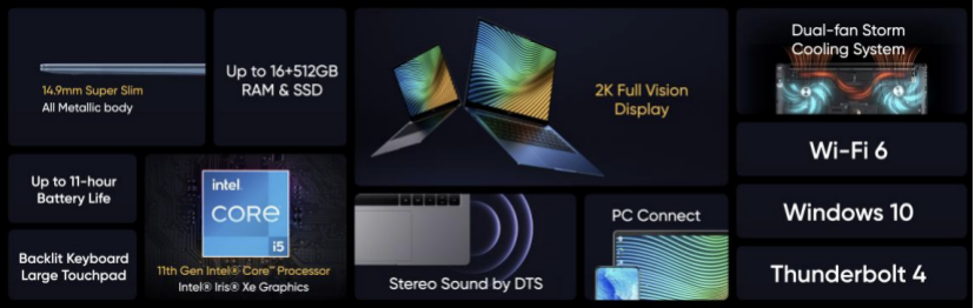 realme Book is powered by an 11th Gen Intel Core processor, dual-fan Storm Cooling System, that ensures that even commanding games run flawlessly. It provides up to 16GB Dual-channel LPDDR4x RAM, Up to 512GB PCIe® SSD Storage. 65W Super-Fast Charge technology provides up to 11 hours of battery life.
