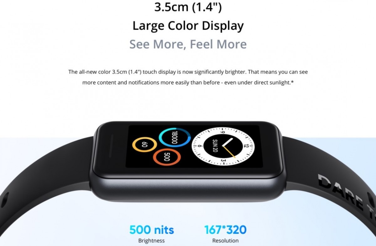 However, it looks more like a smartwatch than a fitness band. The Realme Band 2 features a 1.4-inch color touchscreen with 500 nits peak brightness and 320 x 167 pixels resolution. Moreover, it brings more than 50 pre-installed watch faces however you can also create a custom one by uploading an image through your phone.