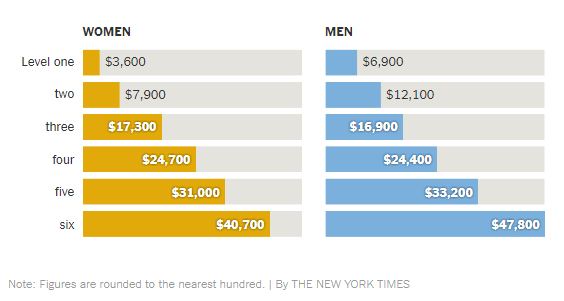 As one can see in the chart women except for level two are being paid less than men and same goes with bonus package women receive less bonus than men except for level three and level four.