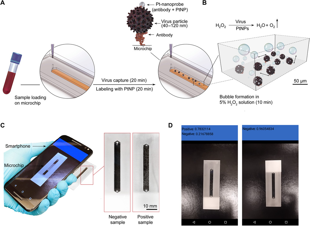 The virus is captured on a microchip that is specially designed with platinum microbes to induce gas bubble formation in the presence of hydrogen peroxide. The formed bubbles are then controlled which then make distinct visual patterns that are classified using a Convolutional Neural Network (CNN) in the smartphone. This approach does not require any additional hardware other than the microchip and that doesn’t even need to be integrated into the smartphone.