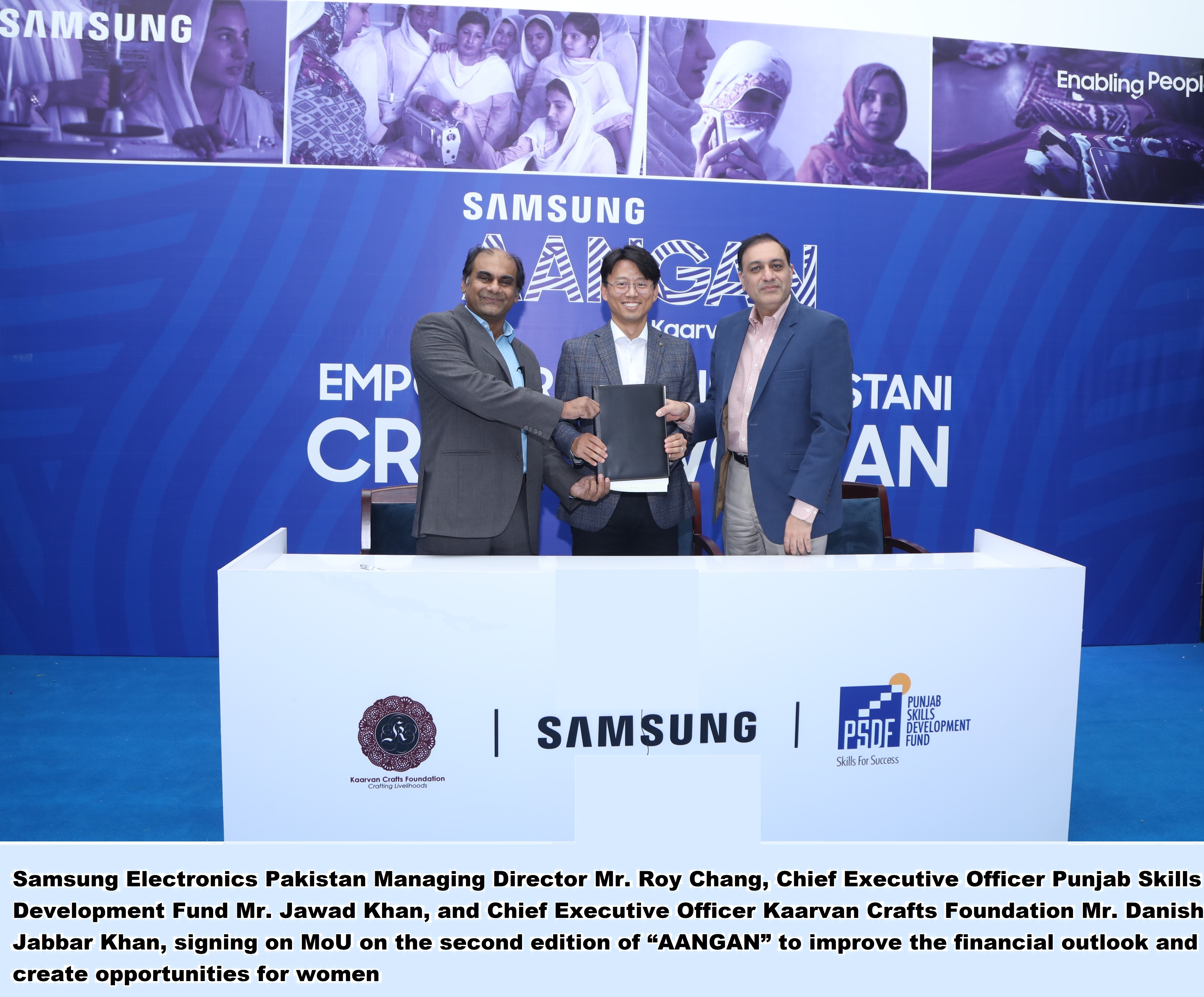The official MOU signing ceremony for this year’s edition of Aangan took place at the Samsung head office in Lahore. The MOU was signed by Mr. Roy Chang – Managing Director Samsung Electronics Pakistan, Mr. Danish Jabbar Khan – Chief Executive Officer Kaarvan Crafts Foundation and Mr. Jawad Khan – Chief Executive Officer Punjab Skill Development Fund.