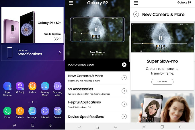 The Experience app has four main sections including New Camera & More, S9 Accessories, Helpful Applications, and Device Specifications. Each section of the app consists of videos, images, and text containing relevant information about Galaxy S9 and S9+.