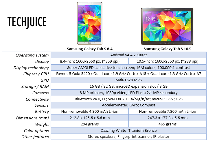 A 4,900 mAh battery powers the 8.4” version of the Samsung Galaxy Tab S, while a 7,900 mAh-rated battery can be found inside the 10.5” model.