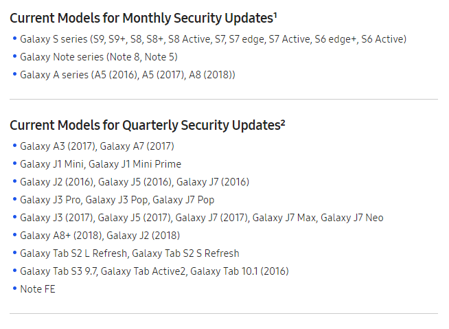 Samsung lists all of its devices getting the monthly or quarterly security updates on the website’s Android Security Upgrades page. It is mentioned there that the list is ‘subject to change’ as the support period can expire for the devices.